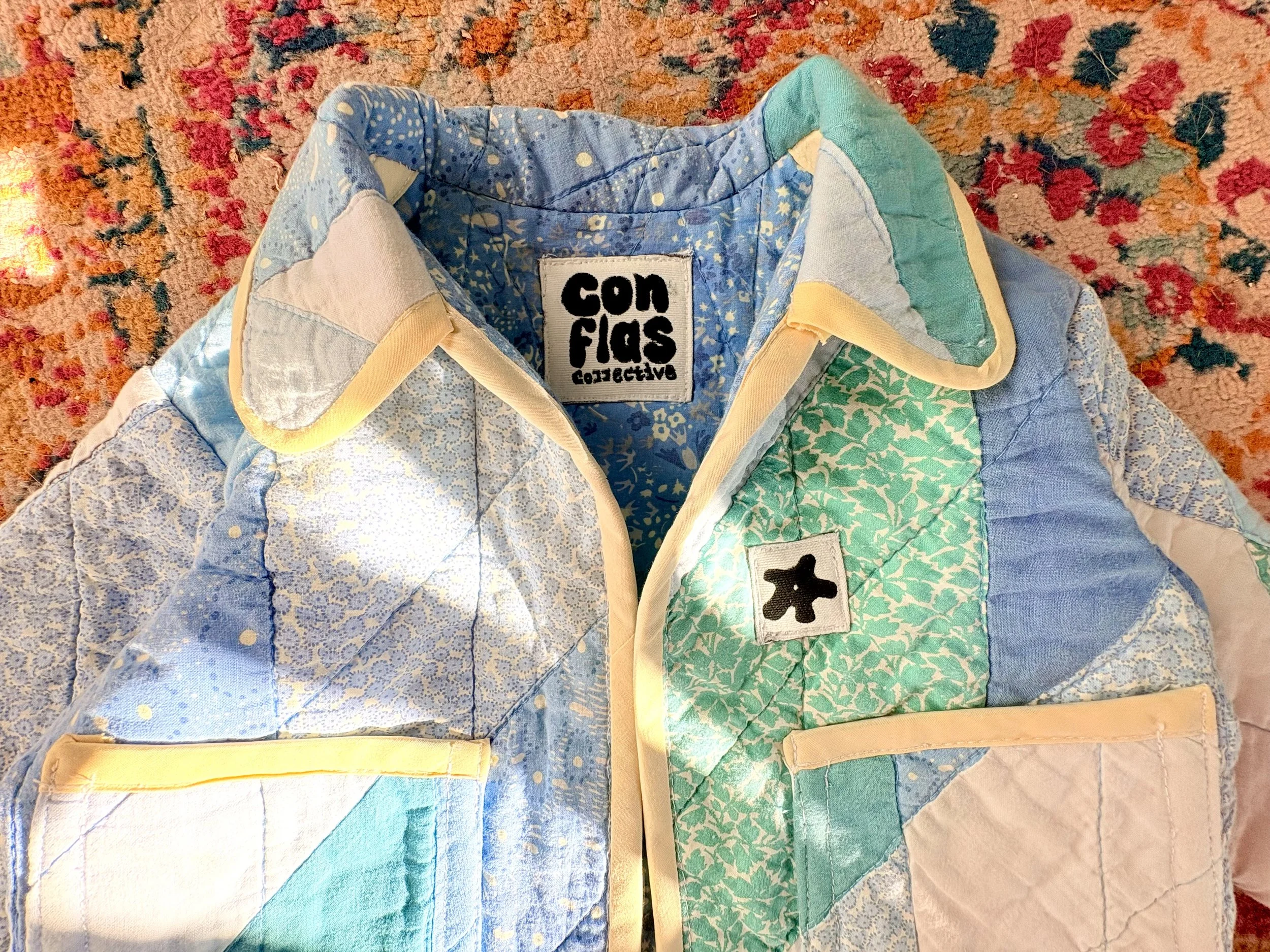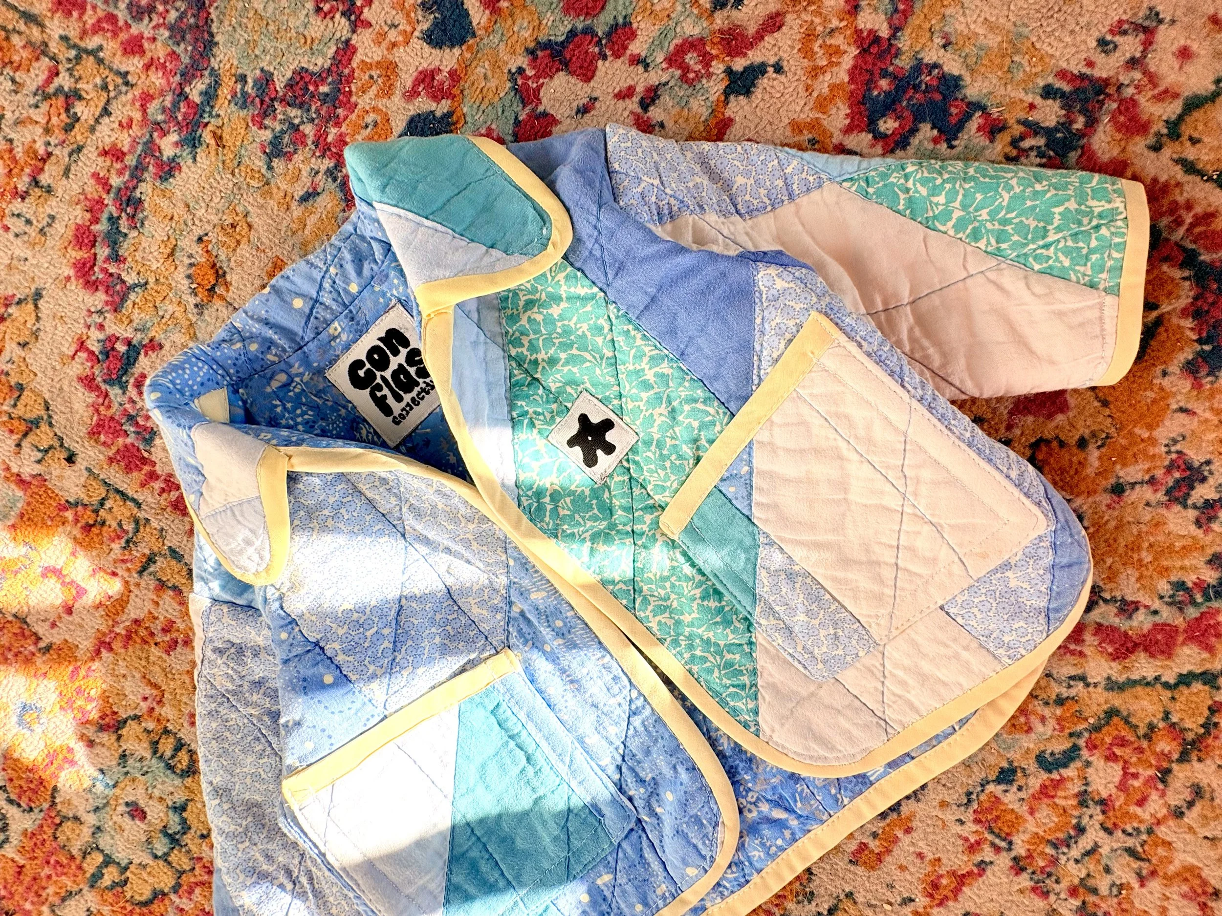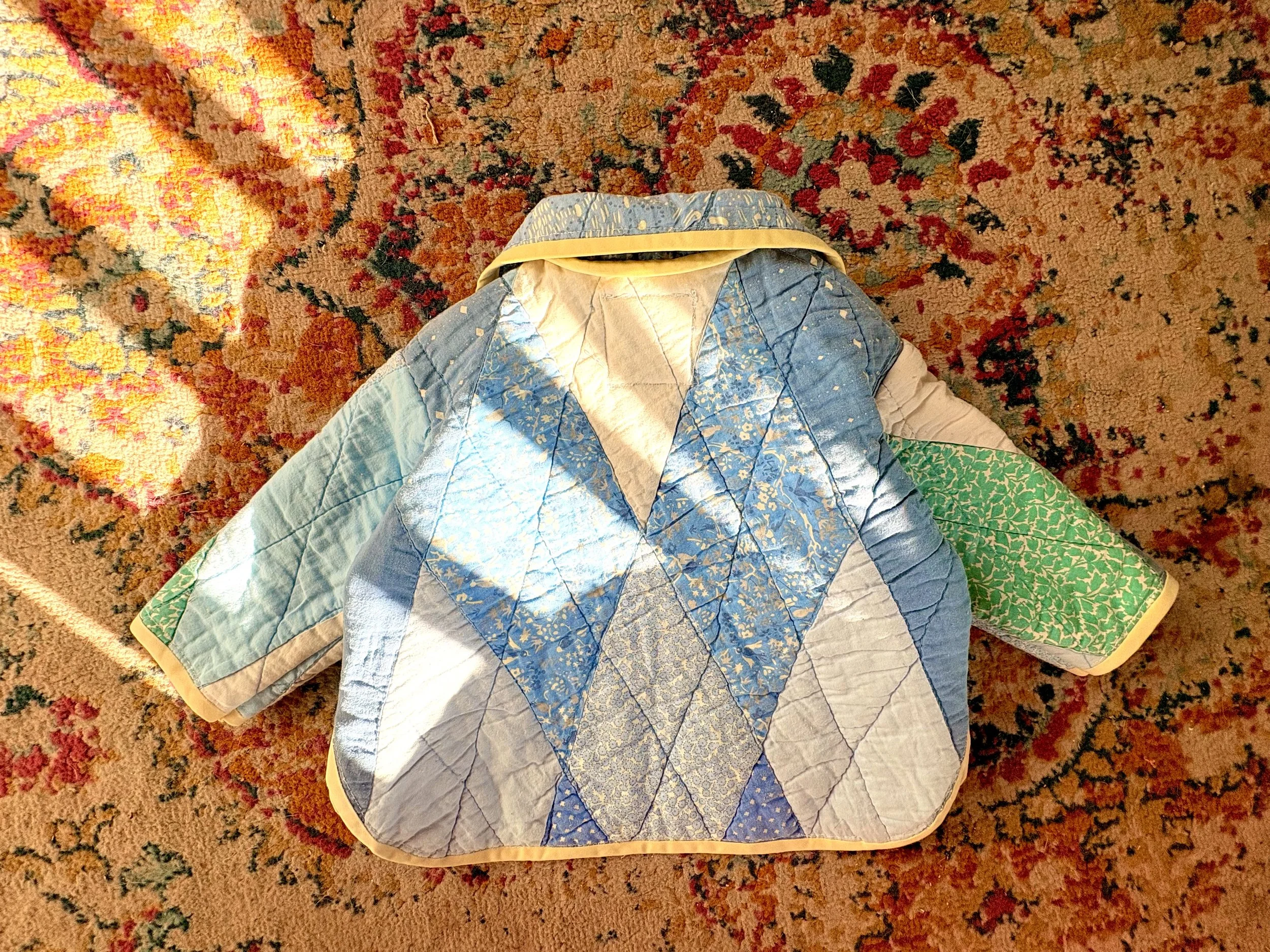 BLUE DAMASK: FOUND TWO PILLOW SHAMS FROM MY LOCAL HUMANE SOCIETY WHICH SUPPORTS SHELTER ANIMALS. RAN OUT OF THE MAIN FABRIC, WHICH I THEN UTILIZED A SOLID WHITE QUILT I HAD THAT WAS SIMILAR IN WEIGHT AND CREATED A CONTRAST YOKE, WHICH ADDS A NICE VISUAL ELEMENT. THIS JACKET IS ALSO REVERSIBLE.