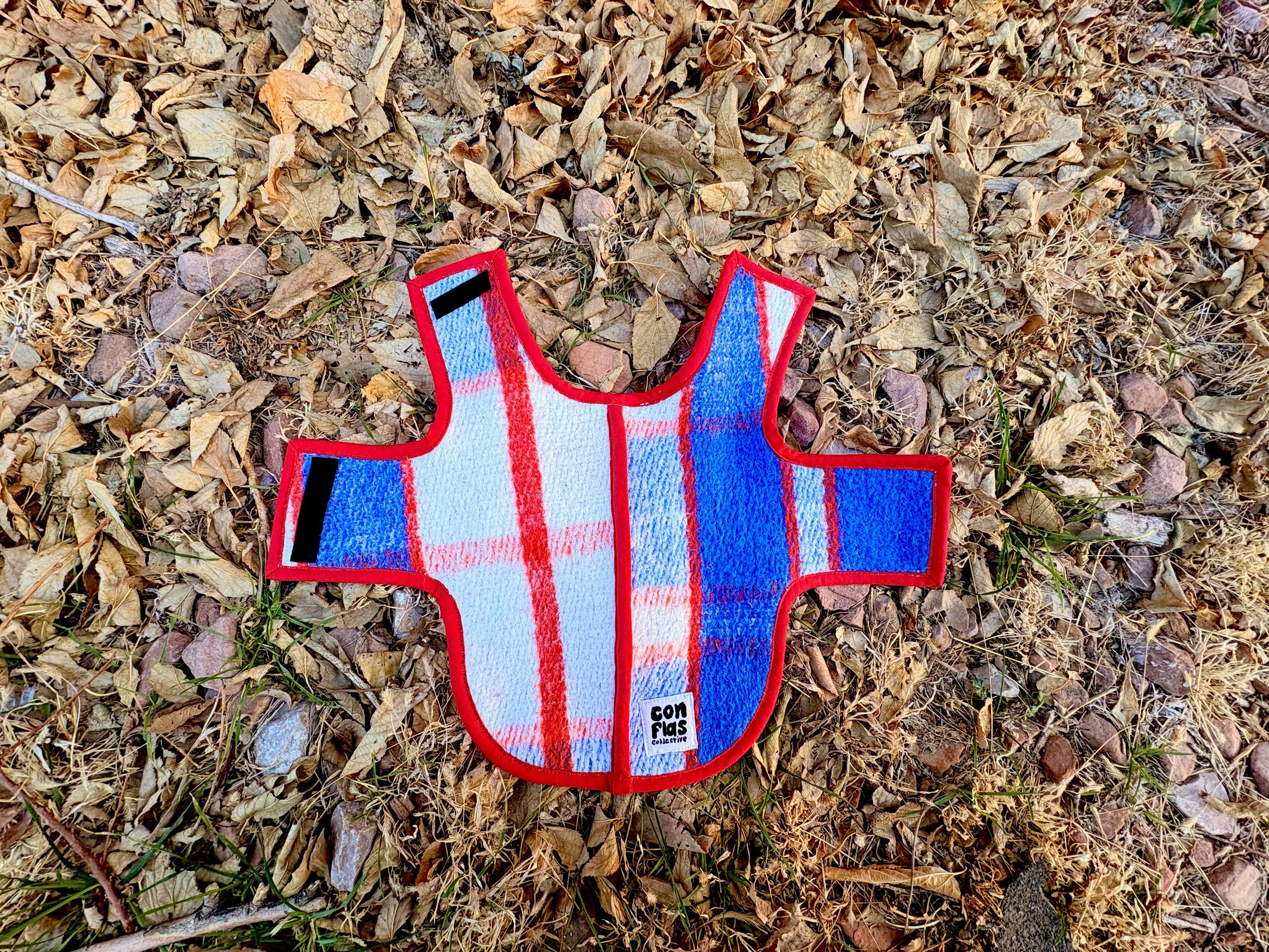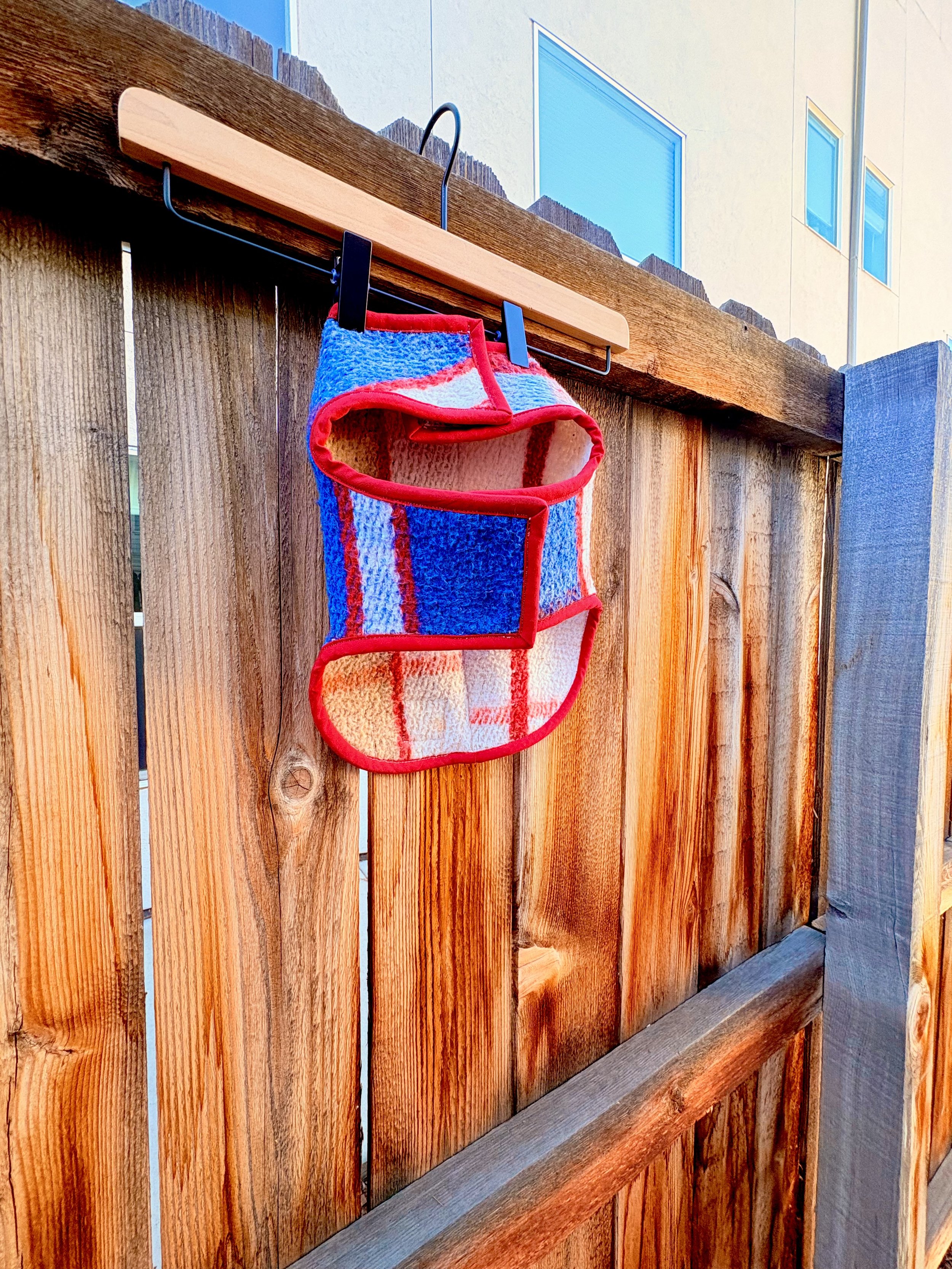 I created and sold a blue plaid fringe jacket out of a secondhand blanket that I sourced. The person who purchased the jacket had an 8-lb dog and wanted a matching dog vest. I had just the right amount of scraps to create it!